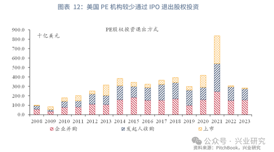 另一方面则是因为企业融资规模较为理性。原因可能包括:一是丰富的股权退出渠道。美国多层次资本市场建设较为完善,企业可以通过并购、股权转让等非IPO方式进行股权价值变现,且VC机构通过并购退出的价值增值幅度长期高于上市退出的价值增值幅度。根据PitchBook统计,2019-2023年,美国一级市场PE机构股权投资退出总规模为21400亿美元,其中IPO为4807亿美元,占比为22.46%,公司并购和发起人收购占比分别为38.04%、39.50%。另外,美国股权投资机构较有耐心,持股周期较长,也会减缓企业IPO的压力。自2015年以来,PE机构每年退出的股权投资的中位持有期持续位居6年以上。VC机构所投独角兽企业的持有期也大多在6年以上。