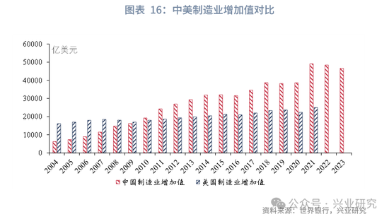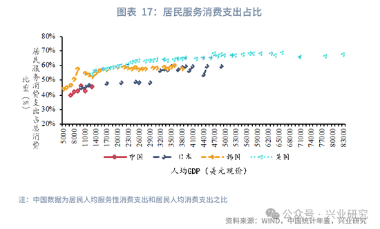 我们可以借助数据直观地了解我国在不同产业层次的位置。从“科学”(论文量)和“技术”(国际专利申请量)来看,美国较我国有一定的优势,尤其是在“技术”领域。从制造业增加值来看,当前我国的制造业增加值远高于美国。从居民服务消费支出占比来看,美国、韩国、日本在人均GDP从1.3万美元向2.0万美元提升的过程中,居民服务消费占全部消费的比重分别从54%、53%、46%提高至60%、59%、48%,而2024年我国居民人均服务性消费支出占比为46%。上述数据表明,美国可能更加擅长“从0到1”,我国在“从1到100”明显占优,而“从100到100”我国则有广阔的挖潜空间。