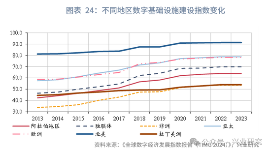 三是在人民币“融资货币”属性强化的背景下,可以增加对一带一路经济体的金融支持,共建数字一带一路,从基建出海走向数字出海,如输出数字基建、算力基础设施、AI大模型等,同时提供配套开发性贷款,以开拓新兴市场,为新经济的发展打开广阔的市场空间。根据中国社会科学院金融研究所、国家金融与发展实验室、中国社会科学出版社联合发布的《全球数字经济发展指数报告(TIMG 2024)》, 2013年到2023年间,北美、欧洲、亚太地区数字基础设施建设指数远高于非洲、拉丁美洲、阿拉伯地区。但中低收入与低收入经济体发展速度较快,说明其存在后发优势,特别是许多一带一路沿线经济体,尚处于数字经济发展初期阶段,需求潜力较大。