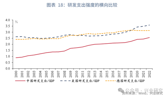 “从0到1”方面,我国正取得快速的进步。近年来我国研发支出强度不断提升,2022年研发支出与GDP之比已经达到2.56%,虽然绝对水平仍低于美国,但展现出强劲的增长势头。