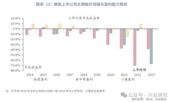 二是理性的二级市场定价。美股的新股溢价较低且有做空机制,长期来看弱资质企业难以获得高估值,市场可以进行自我优化。美股投资者高度关注上市公司的盈利能力,从长周期来看,只有具有较强盈利能力的企业(取过去6年有5年及以上能够实现盈利),才能获得正收益。中等盈利企业(过去6年有3-4年盈利)和弱盈利企业(过去6年有4年及以上年份亏损)长周期涨幅均为负值。