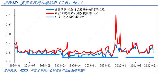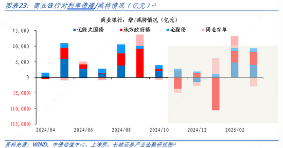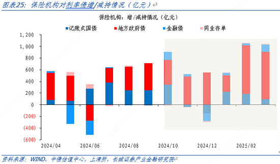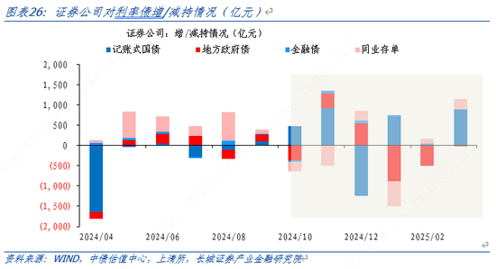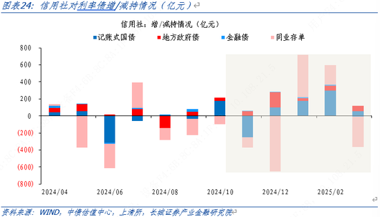根据日前公布的2025年3月机构持有利率债的情况(2025年4月尚未公布),分品种看,各大金融机构均增持国债、同业存单被商业银行和信用社减持。分机构具体情况来看,商业银行2月大量增持国债和政府债,增持金额在4千亿元左右;信用社大幅减持同业存单,小幅增持增持国债和地方债;保险机构所有品种全部增持,以地方政府债为主,体量在800亿元左右;证券公司少量减持地方债,主要增持国债。