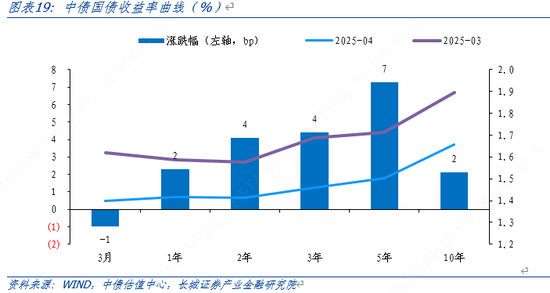 4月,中债国债收益率曲线整体下移,4月30日,10/5/3/2年期国债收益率分别较3月31日下降9BP/11BP/12BP/15BP至1.45%/1.50%/1.53%/1.67%。