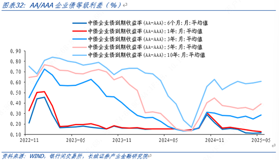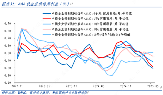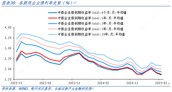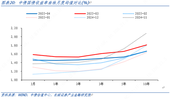 4-5月新闻事件不断,经历了包括关税从急冲突到慢变量的演变、博弈LPR降息、博弈政治局会议财政刺激力度、三部门一揽子金融政策会议等等事件,债券市场始终维持窄幅横盘波动,对事件反应并不敏感,主要原因是前期自由定价。4月初关税冲突激化,10年期国债收益率中枢自1.80%速降至1.65%,此后整月维持在1.65%左右窄幅震荡,直至5月7日降息前期,小幅抢跑略降3BP,最终收于1.62%左右。短端则经历小幅回调,月初在长端20BP左右降幅的带动下,2年期国债收益率自4月1日的1.58%降至4月11日的1.40%。但因资金链没有完全放松,加之降准迟迟没有到来,市场追逐长端,2年期又小幅回调至1.47%左右。当前短端在降准降息加之隔夜放松的推动下,逐渐往1.40%的方向走。