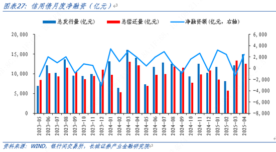 发行与净融资方面:4月份,包括短融、中票、企业债、公司债、定向工具在内的信用债合计发行规模为1.50万亿元,总偿还量为1.25万亿元,净融资额为2461亿元,净融资额较上月扭负转增,约涨3718亿元(3月净融资额为-1256亿元),比去年同期增加近一倍(去年同期净融资为1364亿元)。