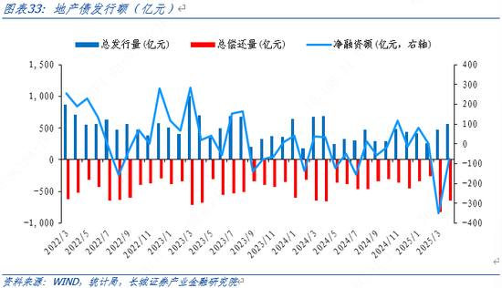 地产融资方面,截至4月30日,4月地产债总发行量为566亿元,环比继续增加(前一月为474亿元),但较去年同期(701亿元)仍有较大缩水;总偿还量为640亿元,净融资额在负区间有所收敛,自上月的-339亿元升至-74.6亿元。