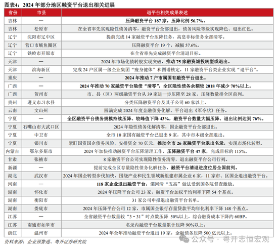 第二,融资平台退出加快,2024年全国“退平台”数量近7000家。监管部门要求,各地融资平台退出时间不得晚于2027年6月末。根据财政部部长在全国人大记者会上披露,2024年四季度,置换政策实施后融资平台减少了4680家,占全年减少总数的三分之二以上。据此估计,2024年地方融资平台累计压降数量接近7000家。从区域看,重点省份中,2024年末宁夏、内蒙古融资平台数量与2023年3月末数量相比分别压降76%、66.5%,吉林、辽宁压降幅度均超过50%,位居全国前列;天津“清理撤并融资平台75家”。非重点省份中,江苏“压降50%以上”;新疆“融资平台清退进度位居全国前列”;河南“118家企业退出融资平台”。