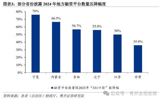 2、融资平台退出加快,2024年全国“退平台”数量近7000家,政府融资职能加快剥离。从公开信息可知,宁夏、内蒙古融资平台数量与2023年3月末相比分别压降76%、66.5%,吉林、辽宁压降幅度均超过50%,位居全国前列。