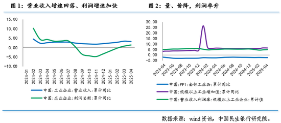 量-价-利润率三要素表现为一升两降。1-4月份,工业增加值同比增长6.4%,较1-3月回落0.1个百分点。PPI累计同比为-2.4%,降幅较1-3月扩大0.1个百分点。规上工业企业营业收入利润率为4.87%,较1-3月上升0.17个百分点。利润率增速持续回升,带动工业企业盈利加快恢复。
