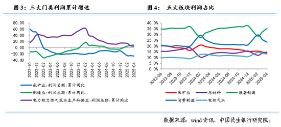 从三大门类看,1-4月采矿业利润总额同比下降26.8%,降幅较1-3月扩大1.3个百分点。三要素中,采矿业工业增加值同比增速为6%,较1-3月回落0.2个百分点;营业收入利润率同比下降17.56%,较1-3月扩大1.46个百分点;价格涨跌互现,1-4月煤炭开采和洗选业、石油和天然气开采业PPI较1-3月回落,黑色金属矿采选业、非金属矿采选业价格改善。煤炭、石油等权重领域价格中枢继续下移,加之营收利润率下滑、需求疲软等因素,拖累采矿业利润降幅扩大。