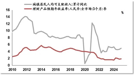作为金融资产,理财收入长期以来是居民财产性收入的重要来源。过去十年,伴随着持续地降准降息,国内金融市场主要利率水平持续下降。2019年10月至2025年5月,中国贷款市场报价利率(LPR)持续走低,5年期及长期LPR利率从4.85%降至3.6%;1年期LPR利率从4.2%降至3.1%;同期银行间同业存单收益率跌破2%,十年期国债收益率从3.2%左右水平降至1.65%。以商业银行为代表,包括保险、证券、信托及资产管理公司在内的传统理财产品收益率持续走低。据统计,3个月人民币理财产品(市场平均)年化收益率从2013年的6%左右一直降到当前不足2%的水平。自2018年9月理财新规发布后,商业银行及其子公司在设计理财产品时,需要在产品流动性风险、信用风险、产品标准化及投资标的信息披露等各个方面均要符合严格的监管要求,此前高风险偏好的投资方式被抛弃。随着银行理财产品收益率应声走低,居民通过购买理财产品实现较高收益以带动财产性收入较快增长的时代已经过去。展望未来2-3年,货币政策仍将保持适度宽松,市场流动性将依然十分充裕,利率水平将继续有所下行,理财产品收益率将进一步走低。