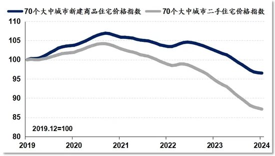 图表4中国70个大中城市新建商品房和二手住宅价格指数(2019-2024)