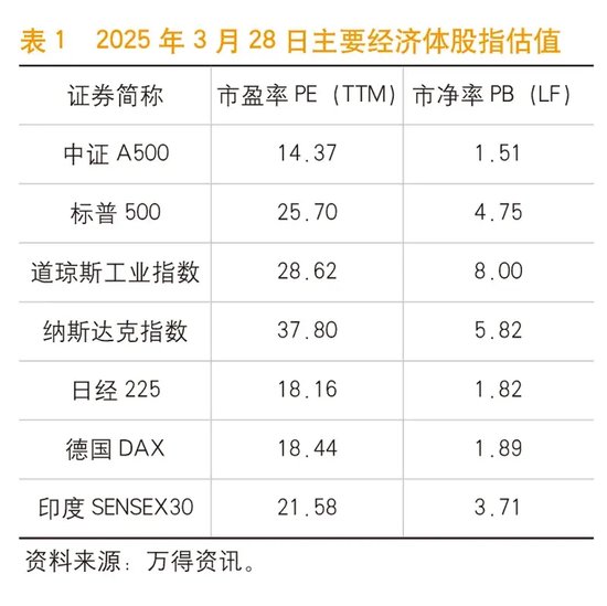 很显然,中长期稳定上涨的预期与机制对于国内外长期资金及投资者来说非常关键。只有当中长期股市收益率明显高于考虑风险补偿后的无风险收益率时国内投资者才更愿意持续入市;只有当投资A股的中长期收益率扣除汇率等风险补偿后明显大于投资于其他国家股市的收益率,国际投资者才会持续加大中长期配置。没有这个前提,中长期资金很难大规模持续入市,市场的稳定性与信心也很难长期有效地建立起来。根据2025年3月28日的数据,中证A500估值在主要经济体股指中仍处于较低水平(见表1)。因此,当前提振信心、稳定股市的目标之一是通过完善规则与机制、实施政策与措施进行引导,吸引国内外资金特别是中长期资金入市,以此提升中国股市的可持续上涨能力,促进中国资产价值重估到达合理区间。
