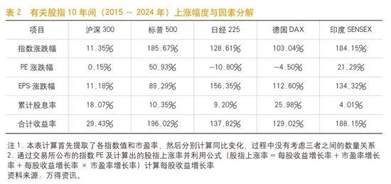 有三个核心变量影响股市涨跌与稳定:税后股息率、每股收益增长率、市盈率增长率。三个核心变量的变化结果基本决定了股票投资收益率,是构建股市稳定机制与中长期提振信心最有效的抓手。经过对过去10年、15年全球前五大经济体中长期股指涨幅的模型实证分析(见表2),每股收益增长(单位股本利润增长)是三大核心变量中贡献最大的变量,市盈率增长率除沪深300外其他四国的波动多沿着PE-Band中心均线上下30%区间波动,是中短期贡献度很大的变量,加上市场总市值巨大,市场信心与成交额放大带来的市盈率与估值明显提升,或信心低迷、成交额缩小导致市盈率与估值明显下跌,在中短期对投资收益的影响更为显著。而股息率及税后股息率通常波动不太大,是市场信心与投资收益的基础变量,可以使投资者获得一定的现金回报;同时,红利要交税、除权,分红虽然可以降低估值,但会阶段性亏损,并不会增加投资者收益,只有因市盈率提升发生填权或超过除权前价格时,投资者才有可能获利。