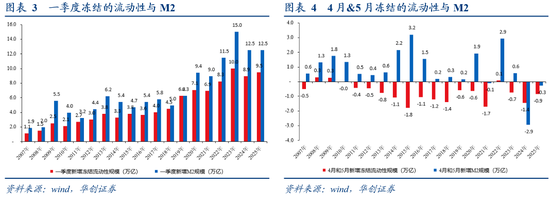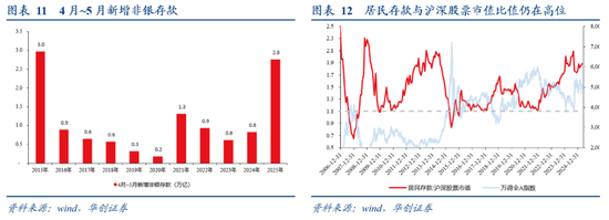 2、当下流动性或正在逐步“解冻”:①从年度视角来看,新增的居民存款和现金占新增M2的比重持续走低;②从高频数据来看,4月~5月新增M2同比少减2.6万亿,但是新增的居民存款仅同比少减5000亿。