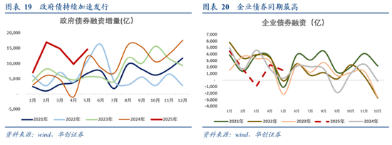 政府部门来看,2025年4月~5月,政府债新增规模2.4万亿,新增财政存款1.3万亿,两者轧差对应政府净支出规模约为1.1万亿,2017年~2024年,这一净支出规模均值0.1万亿,最高0.85万亿(2022年)。值得注意的是,2025年前五个月,政府债发行规模较2024年同比多增3.8万亿,考虑到根据政府预算,全年政府债发行规模较2024年预计多增2.5万亿,由此推断来看,下半年不增加政府债务规模的情境下,后续政府债同比或有回落可能。