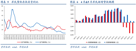 值得注意的是,由于当下居民存款的“解冻”是在M2和居民存款同时下滑的情境下发生的,所以逻辑上不能排除居民拿存款偿还贷款这一行为模式。不过,我们从居民的贷款存款数据似乎尚不支撑这一推测。一方面,居民贷款同比近期增速平稳,并未看到趋势性回落,另一方面虽然4月居民贷款转负,但是5月居民贷款新增规模再度转正,对应5月居民整体呈现加杠杆态势。
