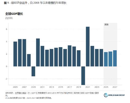 国际纠纷——尤其是贸易纠纷——已经颠覆了在二战结束后助力减少极端贫困和扩大繁荣的许多政策确定性。我们的预测显示,仅今年一年这场动荡就会导致全球 GDP增速比年初的预期降低近半个百分点,降至 2.3%。这是 17 年来除全球经济除衰退之外的最差表现。到 2027 年,预计全球在 2020 年代的GDP 平均增速仅能达到 2.5%,为 1960 年代以来任何一个十年中的最低增速。