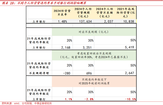 2、经营贷不良率测算:假设21年高风险经营贷在20%-50%违约率下,对25E经营贷不良率影响在-0.4至1.3个点