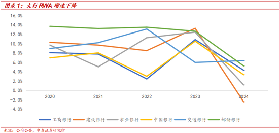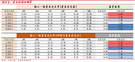 本轮大行资本补充可至少支撑未来五年增长。资本新规后,大行RWA增速下降,工行、建行、农行、中行、交行、邮储2024年RWA增速分别为4.3%、-2.4%、1.2%、3.4%、6.4%、5.3%,我们假设(该假设偏高,可能导致充足率测算偏低,属于保守测算)未来5年RWA增速均为8%,若不补充资本,至2030年,交行、邮储核心一级资本充足率将贴近监管底线,农行距离底线1个点,中行距离底线1.6个点。本轮补充资本后,正常增长状态下,可至少支撑维持未来5年稳定增长,在大行承担支持实体、服务国家建设的背景下,若未来维持合意的资产增速水平,当前为大行补充核心一级资本有其前瞻性和战略意义。