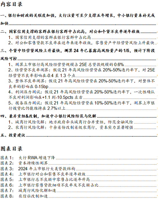 核心观点:1、银行和财政的关联度进一步加强,大行与中央财政关系,地方银行与地方财政关系增强。2、国家信用支撑的客群在银行客群中占比高;近年来不良率对公降、零售升,但零售不良额占比仅三成,占比较低。零售中经营贷风险上升最快,测算24年已暴露不良占偏高风险资产的1/5,预计下阶段风险可控。3、中小银行加快兼并重组&改制,没有“爆雷”的风险。4、结论:银行底层资产风险有兜底,资产质量稳健,基本面从“顺周期”转为“弱周期”。板块业绩和股息率稳定性强,资本补充渠道增加,投资面亦从“顺周期”转为“弱周期”。“对等关税”后,我们持续重点推荐银行板块股,继续看好银行的稳健性和持续性。