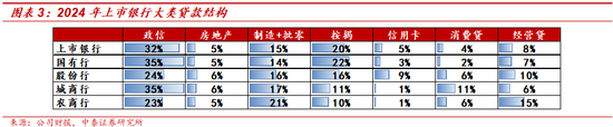 国家信用支撑的客群在银行客群中占比高,化债支持融资平台,国有企业安全边际稳健。从2024年上市银行贷款结构来看,占比较高的包括政府相关(32%)、房地产(B端5%+C端20%)、实体(制造业&批零15%+经营贷8%)、消费相关(信用卡5%+消费贷4%),其中,有国家信用支撑的客群占比高,安全边际稳健。