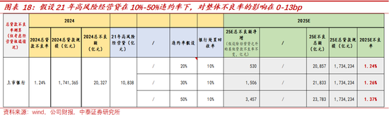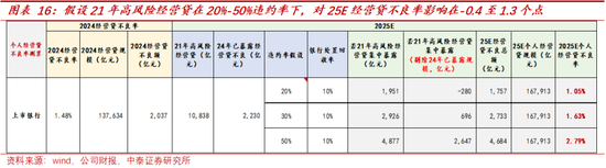 假设其他贷款(剔除个人经营贷)25E不良率维持2024水平,25E个人经营贷发生20%、30%、50%的违约,处置回收率按照10%,不考虑占用核销资源,则上市银行整体贷款不良率则分别上升0、2、13bp至1.24%、1.26%、1.37%。