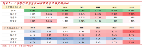2024年经营贷不良率上升最快,新增不良额占零售整体净增不良额的46.3%。(1)零售细项不良率来看,2024不良率由高到低为信用卡、经营贷、消费贷、按揭,分别为2.33%、1.48%、1.48%、0.66%,分别同比提升19、38、10、19bp,经营贷不良率上升幅度最快。(2)不良额占比总不良来看,由高到低为按揭、经营贷、信用卡、消费贷,分别为10.7%、9.8%、8.9%、4.5%。从新增不良额占比来看,经营贷占比最高,占2024年零售净增不良额的46.3%。