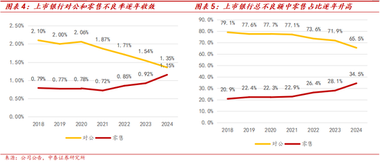 上市银行对公和零售贷款不良率在近年来逐年收敛,对公降、零售升。截至2024年对公、零售不良率分别为1.35%和1.15%,不良额占比分别为65.5%、34.5%,对公不良率仍高于零售,不良规模也仍高于零售。