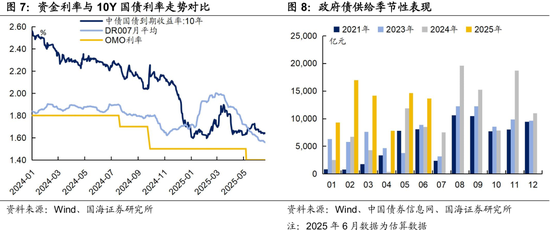向后看,根据2021、2023-2024年的情况,7月政府债供给压力将明显减轻,对于资金面扰动不大。因此,资金利率预计平稳运行,但下行空间也不大,向下难以突破政策利率(OMO)1.4%,利率进一步下行动力有限。