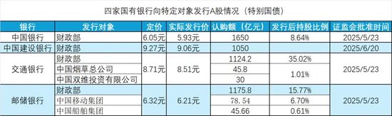 随后,相关流程进入快车道。4月和5月,财政部分别发行了“2025年中央金融机构注资特别国债”一期和二期。四大行则分别向上交所递交了定增申报稿,并相继收到了证监会的定增批文。