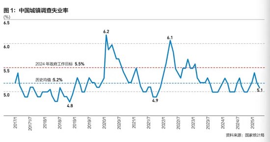 根据国家统计局数据,2025年4月份,全国城镇调查失业率为5.1%(图1),低于年初政府工作报告设定的目标(5.5%),也低于历史均值(5.2%),显示当前就业形势相当健康。仅从该指标来看,当前似乎没必要把“稳就业”放在“四稳”之首。