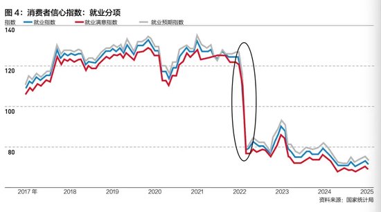 以国家统计局公布的消费者信心指数为例,2022年初,受新一轮新冠疫情冲击影响,城镇调查失业率一度飙升,同期消费者信心指数中的就业分项(包括就业满意指数和就业预期指数两个分项)也大幅下挫(图4)。之后,随着疫情得到控制,经济活动逐步恢复正常,失业率逐渐回归到历史均值甚至更低,但就业信心指数却持续下挫,未回升至2022年之前的水平。
