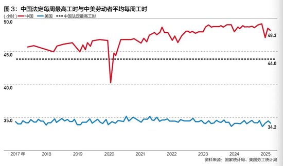 我国《劳动法》第三十六条规定,“国家实行劳动者每日工作时间不超过八小时、平均每周工作时间不超过四十四小时的工时制度”。但统计数据显示,我国企业就业人员平均每周工作时间长期高于法定工时,而且呈上升趋势,从2017年6月的45.7小时增长到2025年4月的48.3小时(图3)。
