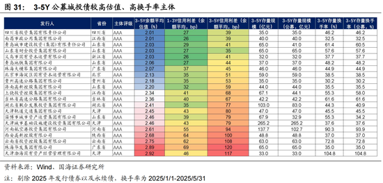 波段操作方面,正如前文所述,当前期限利差还处于较高位置,因此建议可关注3-5Y估值较高、流动性较好的城投债,尤其是有一定期限利差补偿的标的,不仅可博弈资本利得,也能进一步博弈骑乘收益。此处我们梳理了AAA评级主体、3-5Y存量公募债在30亿元以上、3-5Y公募债估值在2%以上、2025年3-5Y公募债换手率在30%以上的主体,如图31所示,共计21家,可结合波段操作增厚收益。