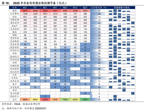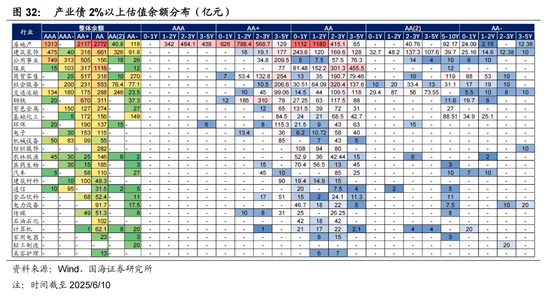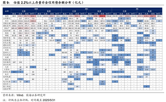 高估值信用债供需矛盾仍然突出。以非金信用债为例,截至2025/5/31,估值在 2.2%以上信用债存量规模为72012亿元,占存量信用债比重24.4%,其中公募信用债38847亿元。从品种来看,高估值存量信用债主要集中在城投、房地产、非银、综合、建筑装饰、钢铁、煤炭等行业,其中煤炭、钢铁基本集中在AAA主体。