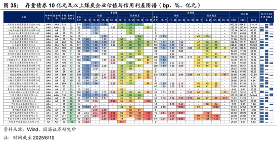 目前短端普通煤炭债估值普遍较低,且多数主体债券估值差异不大,可结合风险偏好围绕较高估值下沉,短端可关注冀中能源集团,截至2025/6/10,估值多在2.1%左右,进一步关注资质较弱主体短端永续煤炭债,如华阳新材、开滦集团、平顶山天安煤业等主体。