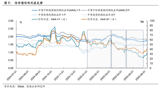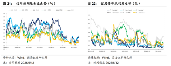 信用债在票息加持下,年初以来信用利差大幅收窄,上半年信用债信用利差走势可分为三个阶段:
