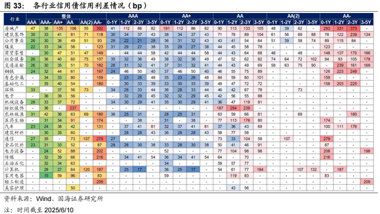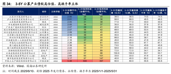 从交易逻辑来看,可关注3-5Y流动性较好的产业债,此处我们梳理了AAA评级主体、3-5Y存量公募债在30亿元以上、3-5Y公募债估值在2%以上、2025年3-5Y公募债换手率在30%以上的主体,如图34所示,共计16家,可重点关注估值较高、存在较大期限利差的主体,如云南省能投、厦门国贸、厦门建发集团、中国光大控股、金融街控股等。