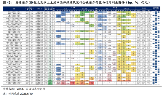 中高评级建筑装饰类主体以央企和地方国企为主,多数主体中短端估值较低且分化有限,同时估值曲线同样较为平坦,期限利差空间有限,建议在挖掘投资标的时控制参与期限。风险偏好相对较高的机构可适度博弈陕西建工、济南建工短端信用债。另外可适度关注大型建筑装饰类央企子公司中短端永续债,如中交城市投资控股、中铁隧道局集团等主体。