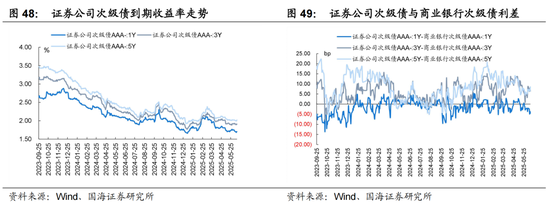 非金信用债一级发行呈现一定分化。发行期限方面,城投债发行期限稳中有升,城投债5月份一级平均发行期限达到3.77Y;而产业债一级发行则受市场影响更加明显,一级平均发行期限多在3Y-3.5Y波动。发行成本方面,非金信用债均呈下降态势,其中产业债平均发行成本仍显著低于城投债,但产业债一级发行成本同样受市场波动影响更大,如2025/3以及2024/10产业债一级平均发行成本环比增加相对明显。