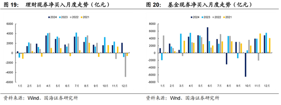 从2021-2024年机构买债行为来看,理财、基金现券净买入主要在7、8月份,其中基金则更易受到市场波动影响,2024年在8、10月呈净卖出态势,整体来看9、10两月机构配债需求一般,建议关注此阶段债市潜在风险。
