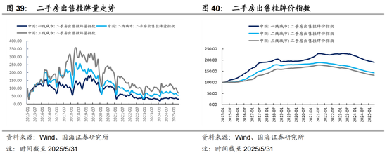 房地产市场仍需时间改善,从2025年1-5月60城商品房成交面积来看,市场成交同比并未有明显改善,一线城市商品房成交面积也仍然较弱,市场仍未见明显改善迹象。进一步从二手房挂牌情况来看,二手房挂牌价仍处于下跌通道中,也显示出当前二手房市场仍较低迷。