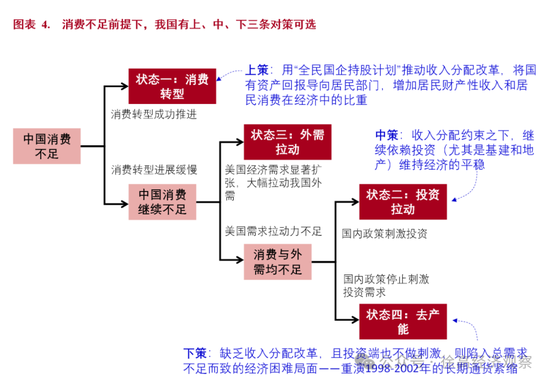 在这方面我国有上中下三策可选。上策是优化收入分配结构,增加居民收入占GDP的比重。尤其是要将国有资本的回报更多地转移给消费者。过去,我国国有资本回报在运用方面重积累、重投资,这在短缺经济的环境中是完全正确的。但随着经济形势的变化,我国国有资本回报的运用方向也应该更多地转向提升民众收入和消费,如此方能引导我国走上一条供需更为平衡,经济增长更具内生可持续性,以及经济增长果实更多惠及普通老百姓福利的消费转型之路——此为上策。徐高(2024)给出了如何走“上策”的切实可行的政策建议。