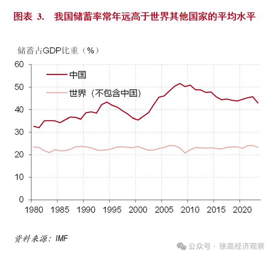 但看待事物一定要辩证二分地来看。消费不足的状况虽然有以上所说的这些弊端,但也有其长处。作为同一枚硬币的正反两面,消费不足同时意味着经济中较高的储蓄和投资占比。在过去四十年中,我国的储蓄率常年处在高位,大概是世界其他国家平均水平的两倍。高储蓄和高投资给我国带来了较快的资本积累速度和经济增速。(图表3)
