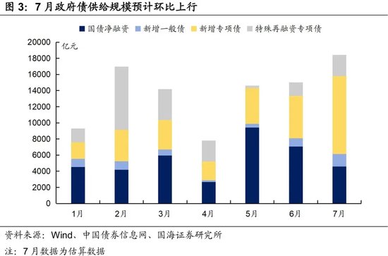 但尚有部分地区尚未公布发行计划,我们通过2024年该地区新增债务限额全国占比,估算地方债新增情况。经估算,7月份新增地方一般债、专项债分别为1541亿元、9647亿元,合计环比6月份实际发行值上行4907亿元。
