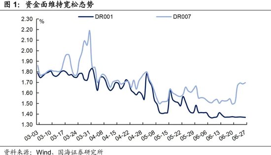 ②央行呵护资金面态度积极。6月同业存单到期规模明显上升,发行压力较大,央行进行两次买断式逆回购,规模总计1.4万亿元,有效补充了资金面缺口。同时6月底跨月阶段,DR001利率仍维持在1.4%的OMO之下,表明央行对资金面支持力度不小。