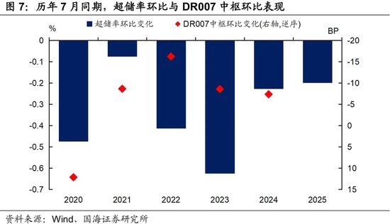 ①跨季后商业银行MPA考核结束,通常会增加资金融出,补充银行间流动性缺口。这部分资金需求不易测算,不过对比历史同期,2020-2024年超储率环比均下降,但资金利率DR007中枢大多也在下降。因此,我们认为跨季后7月份商业银行资金面整体可控,DR007中枢有望小幅回落;