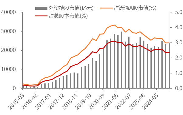引进来方面,截至2025年3月末,外资持有A股2.36万亿元,占A股全部市值2.99%、占流通市值2.36%,与2021年6月末的2.99万亿元、3.99%、3.03%相比呈现下滑趋势。2025年2月17日国务院办公厅发布《2025年稳外资行动方案》,提出“加大对上市公司、境外基金和投资机构等的宣介力度,引导更多优质外资长期投资我国上市公司”;修订后的《外国投资者对上市公司战略投资管理办法》降低了外国投资者对上市公司实施战略投资的门槛。人民币国际化有助于便利外国投资者的资金使用,进一步增强外资来华投资意愿。