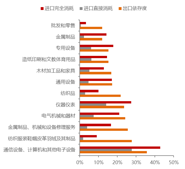 关于(2),主要与企业的微观经营有关,需要考察对不同行业的影响差异性。使用统计局公布的目前最新的《非竞争性投入产出表(2020年)》,计算各部门的出口依赖度、进口直接消耗系数和进口间接消耗系数,发现:人民币升值对于a)纺织服装鞋帽皮革羽绒及其制品,b)金属制品、机械和设备修理服务,c)纺织品等部门的负面冲击较大,但对于d)石油、炼焦产品和核燃料加工品,e)燃气生产和供应等进口占比较高的部门存在正面影响。